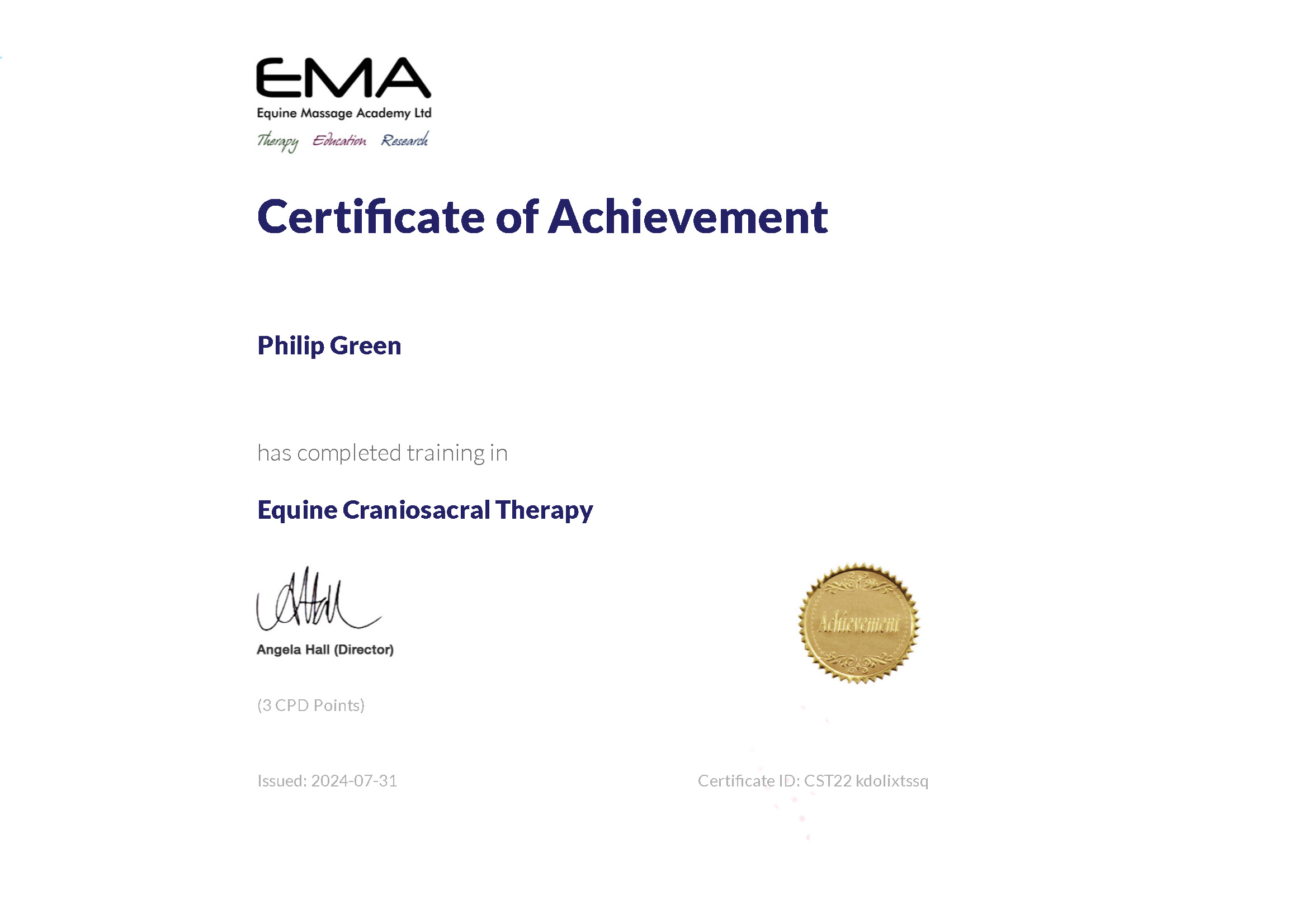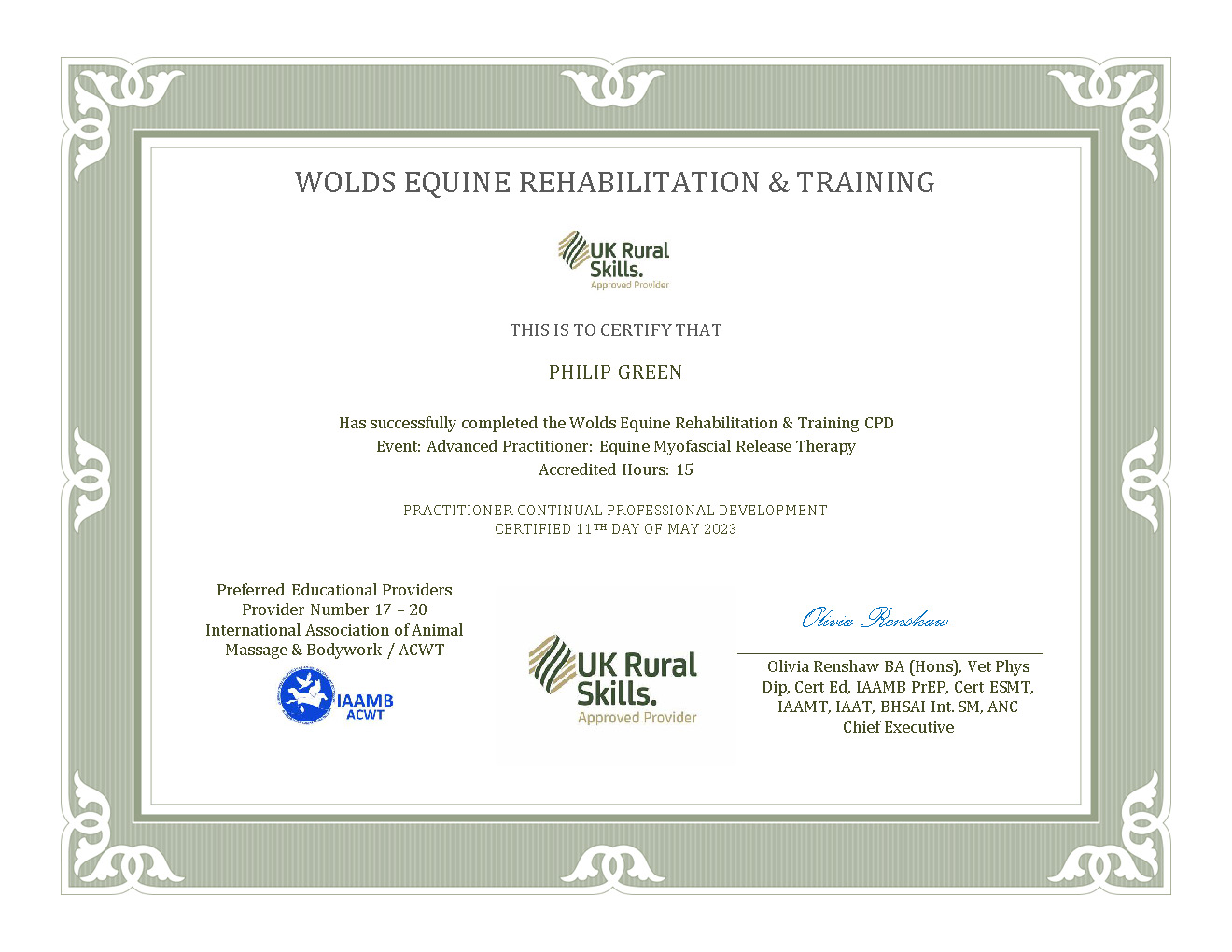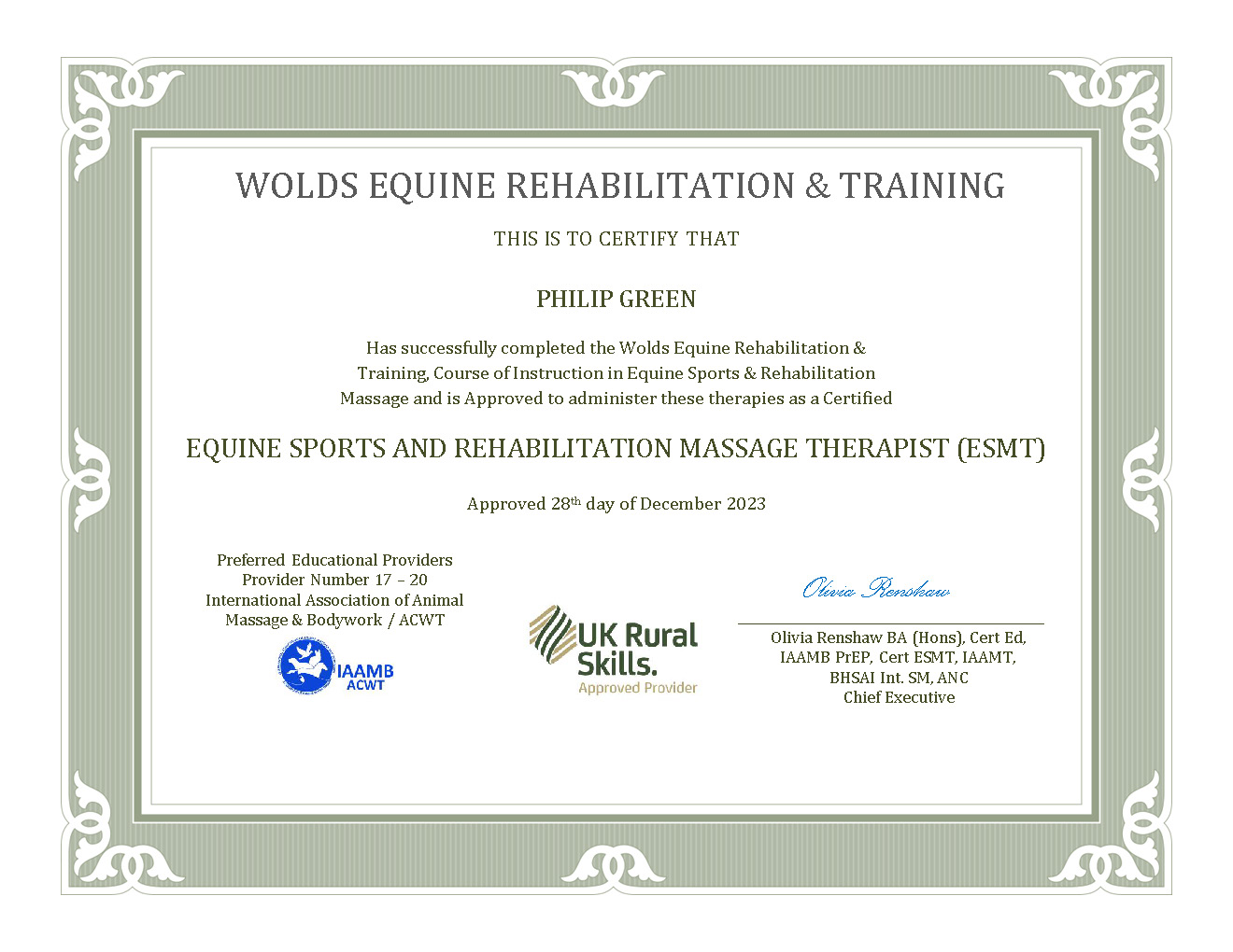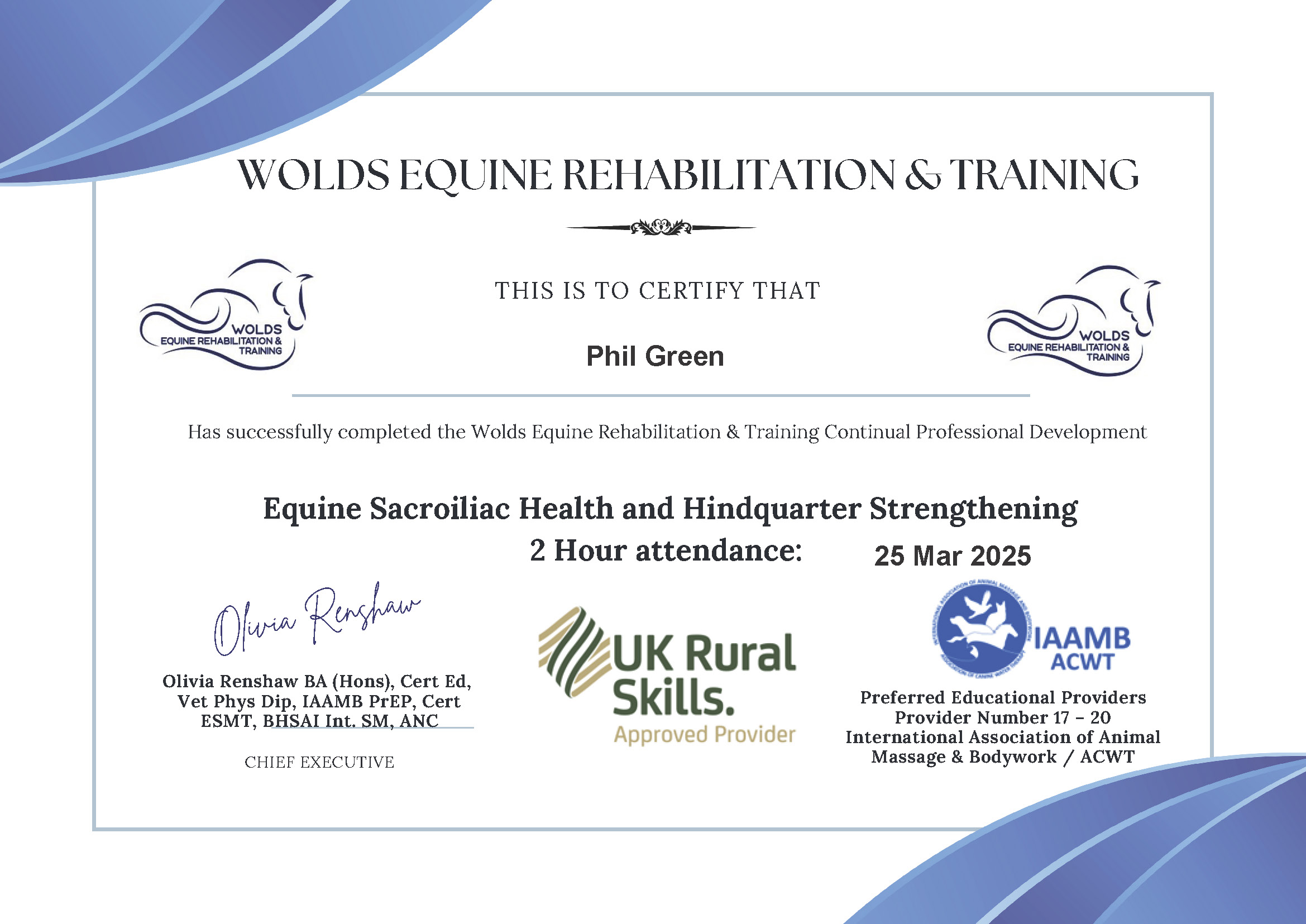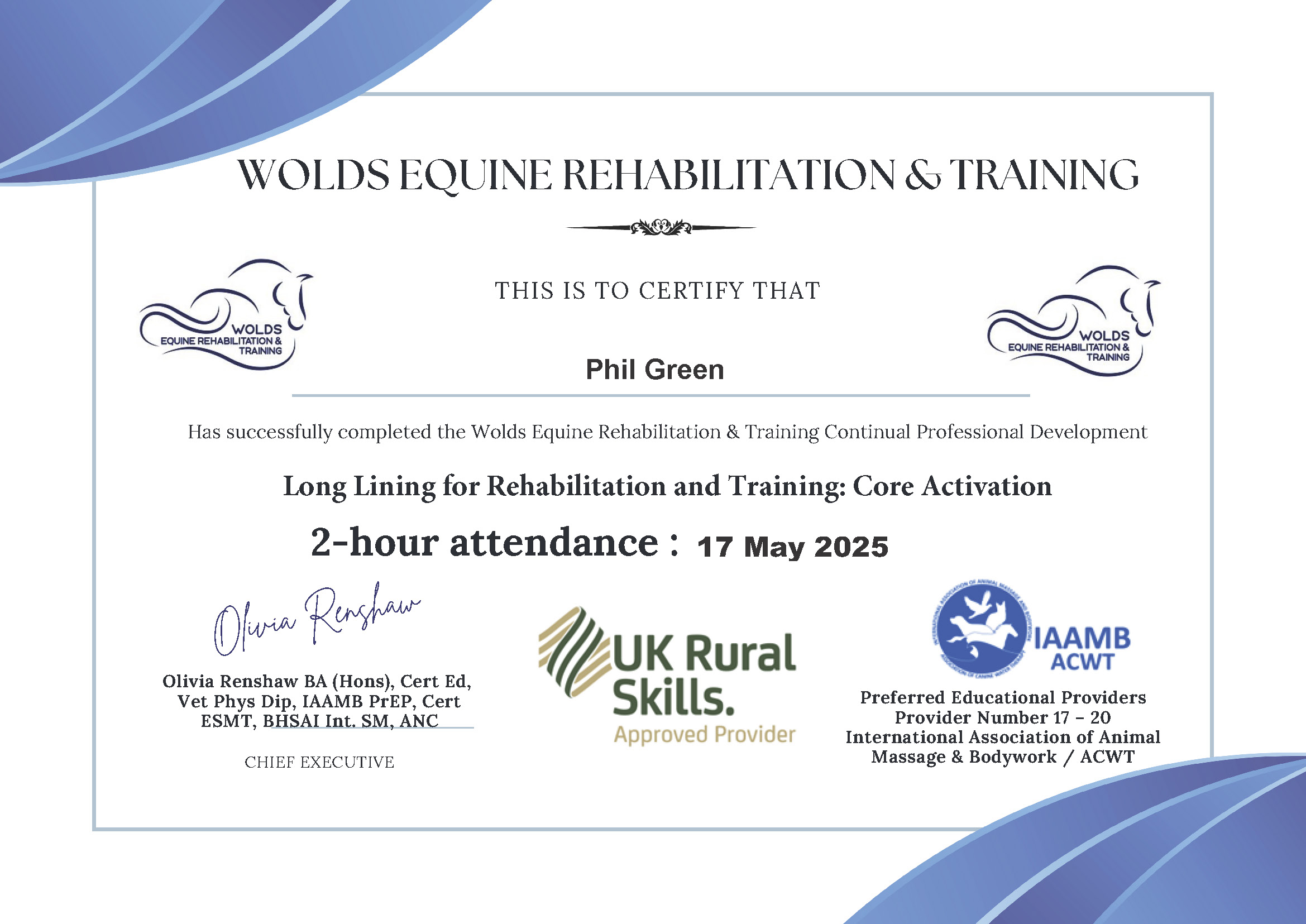 As a Cert. ESMT & also a member of IAAT, UK Rural Skills & IAAMB I am committed to Continuing Professional Development each year.